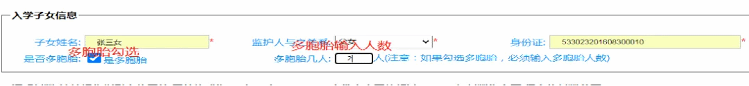 需要注意的是监护人填父母任意一方姓名即可,不必两个都填。不同的监护人类别,需要上传不同的证明材料,监护人必须根据自己的实际情况如实的选择类别,否则可能导致入学申请在学校初审时不通过。此外监护人类别还关系到后面所能填报的学校,请监护人务必认真选择。2.在户籍所在乡镇街道下拉框中,选择户籍所在乡镇街道。(注:这里只需要输入村或社区名称即可,如:兰花社区,塘子沟村),在现住址栏中输入现居住的详细地址。需要注意的是,该选择必须真实,否则可能导致入学申请在学校初审时不通过。以及导致城乡联动调查中审核不通过。在入学子女信息中依次输入“幼儿姓名”,“监护人与之关系”、身份证号码;如果是多胞胎,请勾选多胞胎前面的框,并在后面“多胞胎几人”里输入多胞胎人数(只需要填数字)。如果不是多胞胎则不需要勾选,也不需要输入人数。