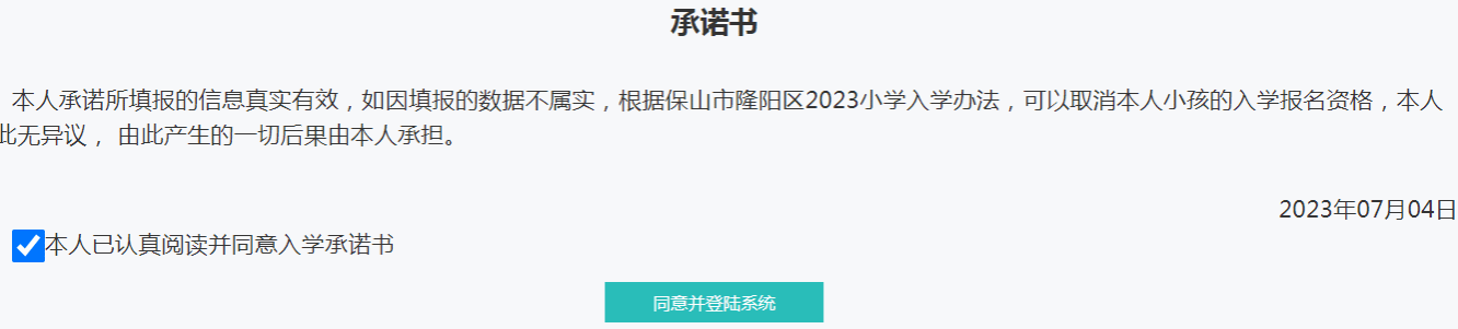 进入报名系统后,系统会在用户第一次登录系统时提示用户签署承诺书。勾选“本人已认真阅读并同意入学承诺书”,点击“同意并登录系统”,进入到报名系统主菜单。