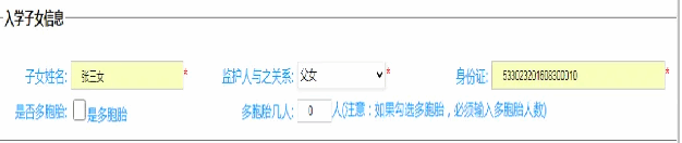 需要注意的是监护人填父母任意一方姓名即可,不必两个都填。不同的监护人类别,需要上传不同的证明材料,监护人必须根据自己的实际情况如实的选择类别,否则可能导致入学申请在学校初审时不通过。此外监护人类别还关系到后面所能填报的学校,请监护人务必认真选择。2.在户籍所在乡镇街道下拉框中,选择户籍所在乡镇街道。(注:这里只需要输入村或社区名称即可,如:兰花社区,塘子沟村),在现住址栏中输入现居住的详细地址。需要注意的是,该选择必须真实,否则可能导致入学申请在学校初审时不通过。以及导致城乡联动调查中审核不通过。在入学子女信息中依次输入“幼儿姓名”,“监护人与之关系”、身份证号码;如果是多胞胎,请勾选多胞胎前面的框,并在后面“多胞胎几人”里输入多胞胎人数(只需要填数字)。如果不是多胞胎则不需要勾选,也不需要输入人数。
