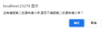 在“第一志愿申请小学”下拉框中选择与证明材料一致的小学,否则报名初审不通过。在“第二志愿申请小学”下拉框中选择与证明材料一致的小学,否则报名初审不通过。需要注意的是第二志愿可以选择不填报,但需要注意的是在系统提示对话框中需要选择“确认”按钮。