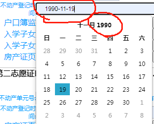 由于《招生通告》中“按报名房产的不动产登记时间启动排序录取程序”的要求,系统对“不动产登记时间”进行了严格的格式输入限制,输入格式必须为:YYYY-MM-DD ,不是2位的月份和日子,需要在前面补0。如2010年1月9日,需要选择或者录入2010-01-09。需要改变年份的双击所显示的年份,如果年份久远的,